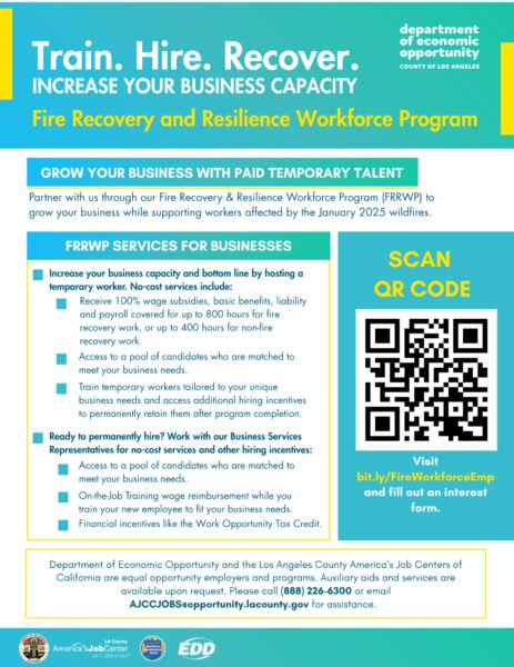The Fire Recovery and Resilience Workforce Program is offering paid disaster relief jobs, transitional employment, and job training to impacted workers. Positions include Intake Specialist and Administrative Support at $25/hr with benefits.